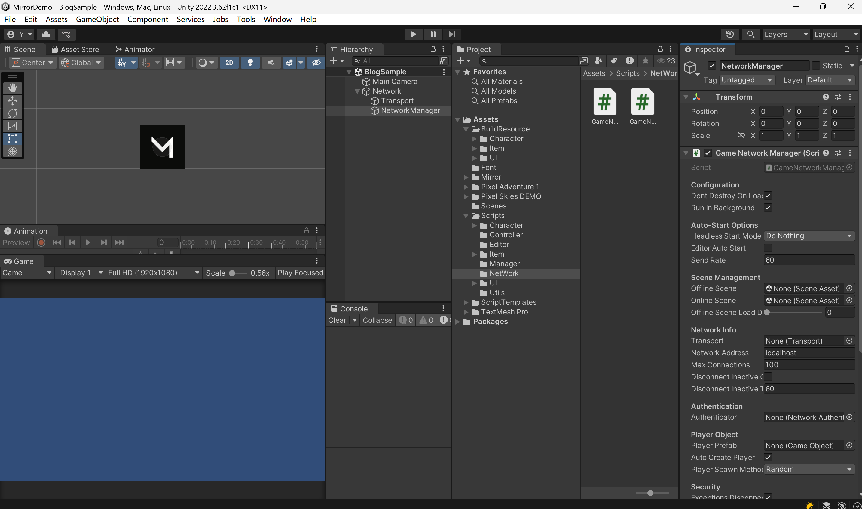 紧接着,同样在Network下面新建一个空对象命名为NetworkManager,在Script找一个好位置,右键创建选择Mirror/NetworkManager,就可以创建我们自己的NetworkManager了。
