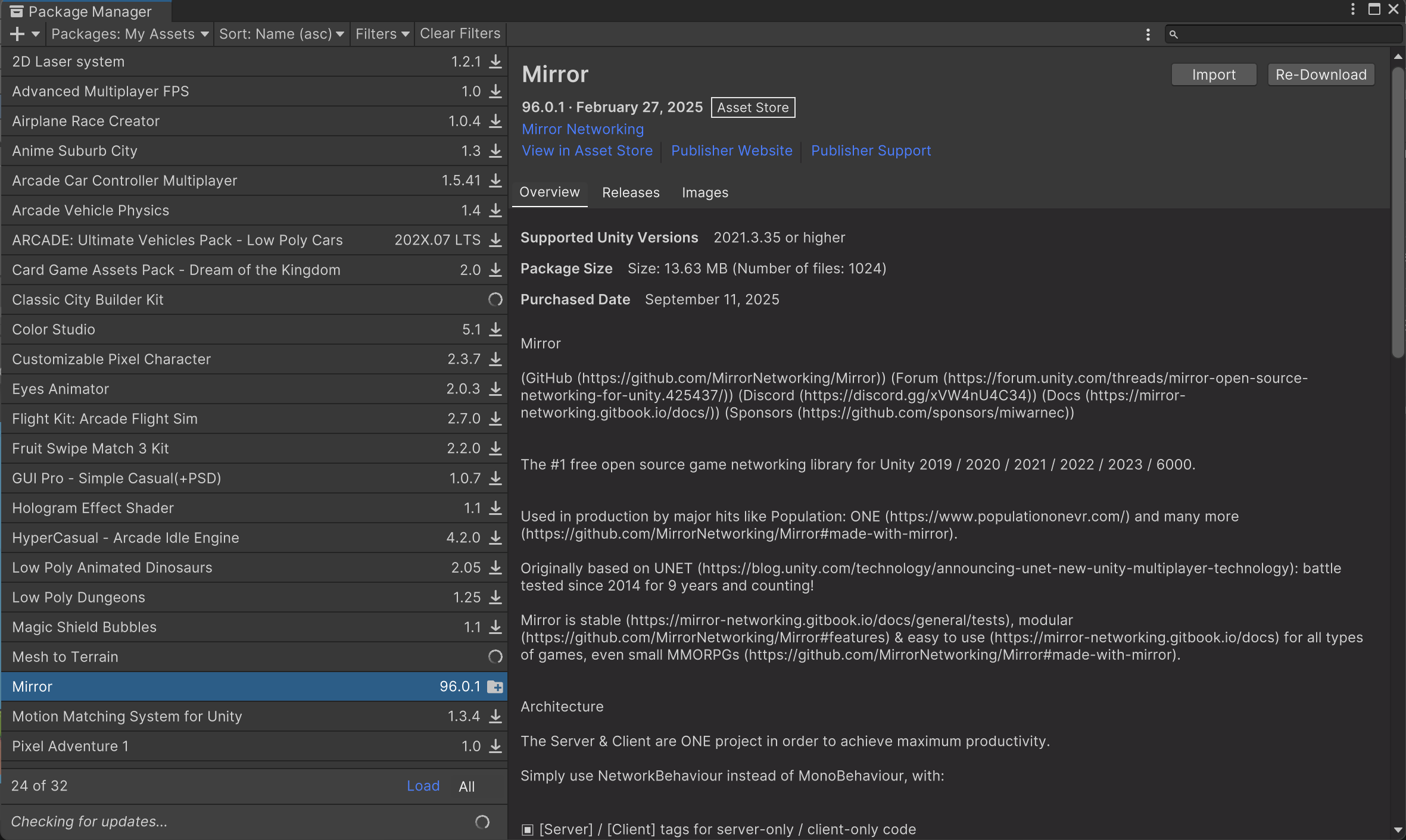 Mirror是Unity的一个免费开源游戏网络库,之前在搜索unity多人游戏的解决方案时发现了这个简单又方便的插件,于是就进行了简单的上手尝试。