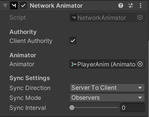 由于我们这里的动画是由客户端进行触发,因此将Client Authority设置为true。需要注意的是,Network Animator本身并不能同步SetTrigger的数值,所以关于Trigger的触发,我们同样要使用Network Animator而不是Animator进行。