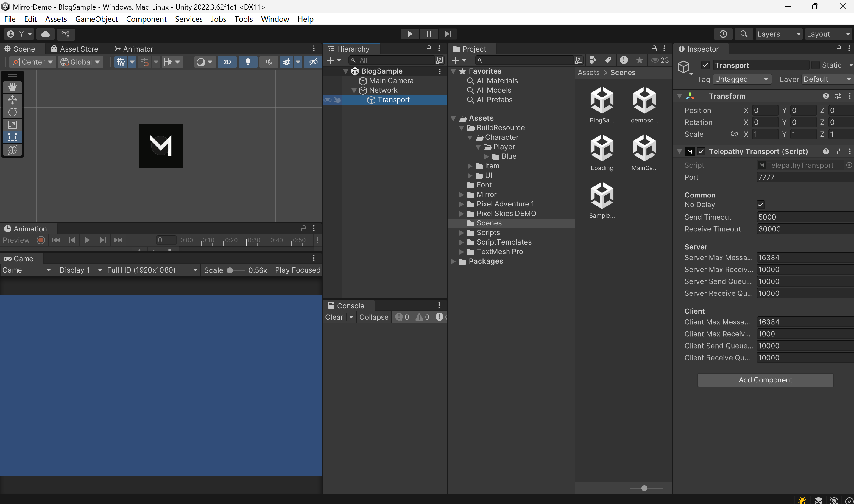 开始使用Mirror的第一步就是创建Transport和NetworkManager。Transport是一个专门处理底层网络同行的对象,Mirror提供了多种网络协议供我们选择,分别是Telepathy(TCP),KCP(可靠的UDP),SimpleWeb(用于WebGL)。这里我选择了Telepathy。除此之外Mirror还提供了很多其他用于增强功能的传输层,不过现在先掠过这一部分。