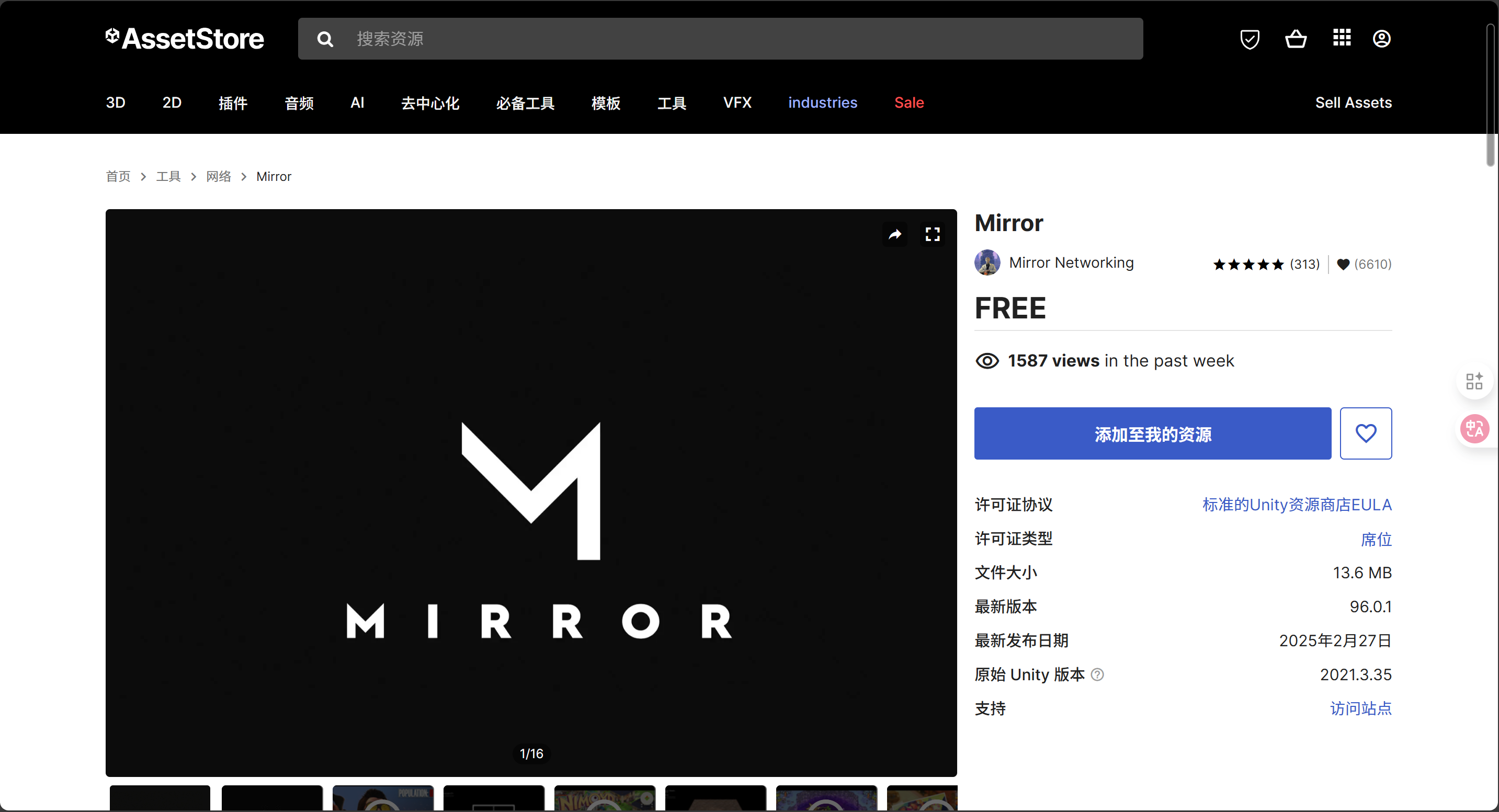 由于Mirror本身也是一个Unity项目,所以导入Mirror非常简单。首先先在Unity资源商店搜索Mirror, 添加到我的资源中。
