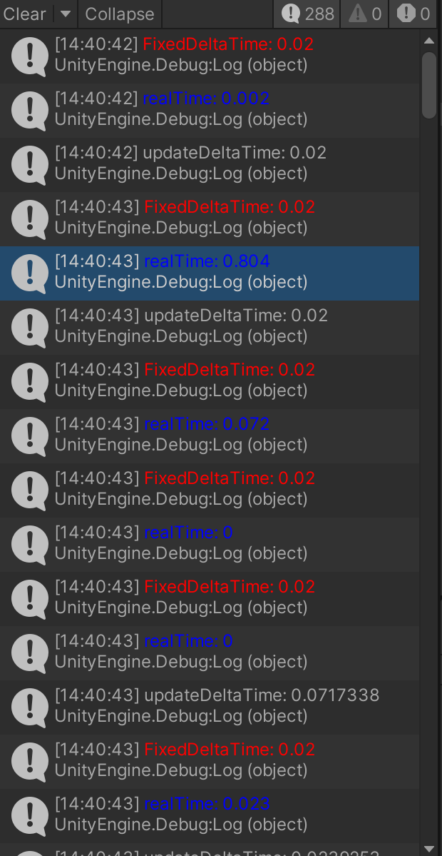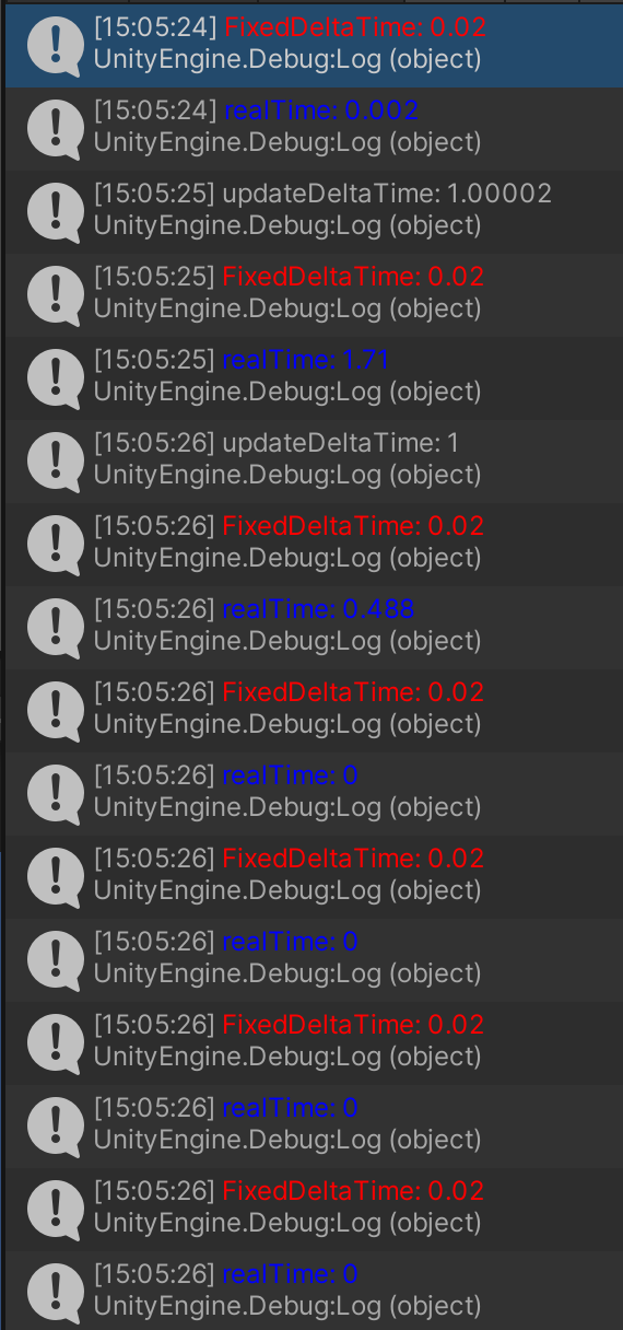 上图中,红的Log为FixedUpdate的fixedDelateTime,蓝色Log为真实时间,白色为Update的delateTime。可以看到,一开始进行的FixedUpdate,然后是Update,而每次的FixedUpdate的真实时间都于Update不一致。在第二次的时候FixedUpdate甚至花费了0.08秒左右,而这之后在FixedUpdate更是在下一次的Update之前连续运行了3次。