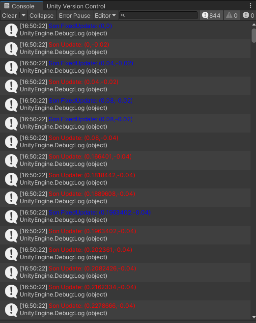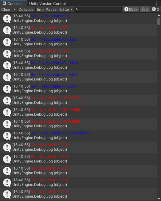 可以看到,在禁用Father的情况下Son的FixedUpdate以每次0.02的速度正常增长。另外,如果仔细观察的话,第一次FixedUpdate打印的时(0,0),也就是说,rigidbody的修改会在下一次物理帧中生效。