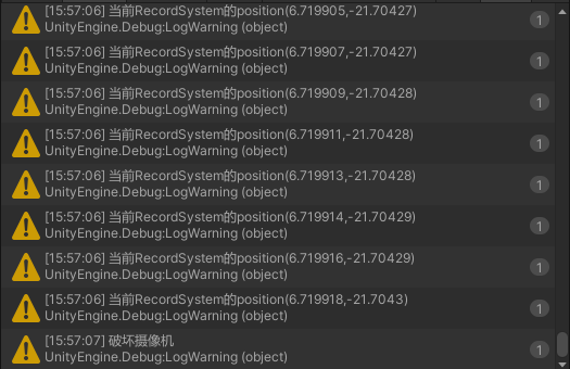 }也就是说, transform.position += new Vector3(direction.x, direction.y) * speed * Time.deltaTime;其实相当于 transform.position += new Vector3(0,0,0); 但是,这样就无法解释旋转之后的事情了,既然旋转之前RecordSystem没有跟着一起移动,那么旋转之后也肯定没有影响啊。然而,有的时候不能太想当然了。只要我们打印一下它的position的值Debug.LogWarning($"当前RecordSystem的position({transform.position.x},{transform.position.y})");