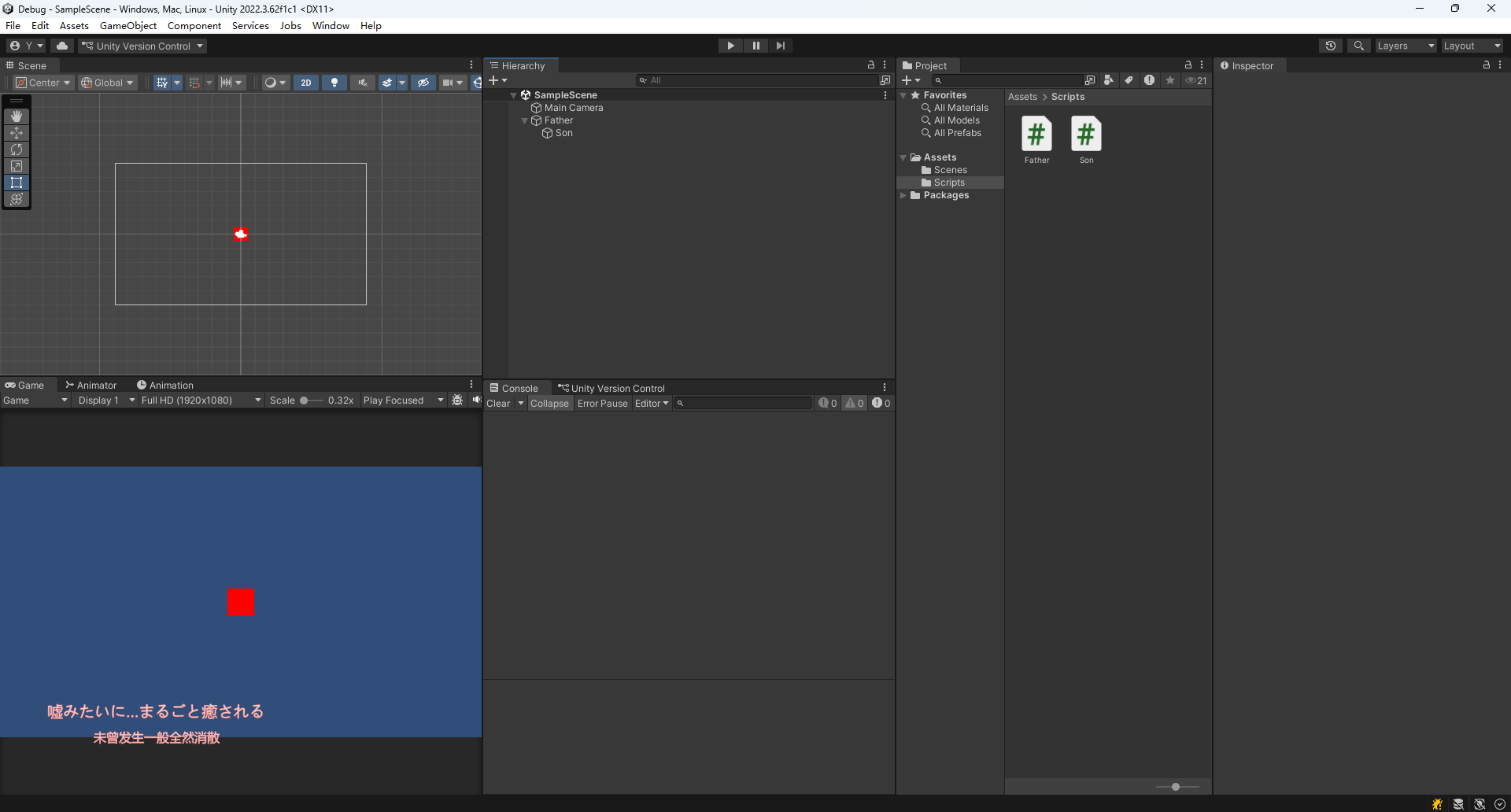 由于上述的场景过于复杂,所以这里我将他简化一下。实际上,这个问题的参与对象只有两方,父物体和子物体,父物体通过transform移动而子物体通过rigidbody移动。所以这里我分别创建两个游戏对象表示Father和Son